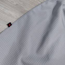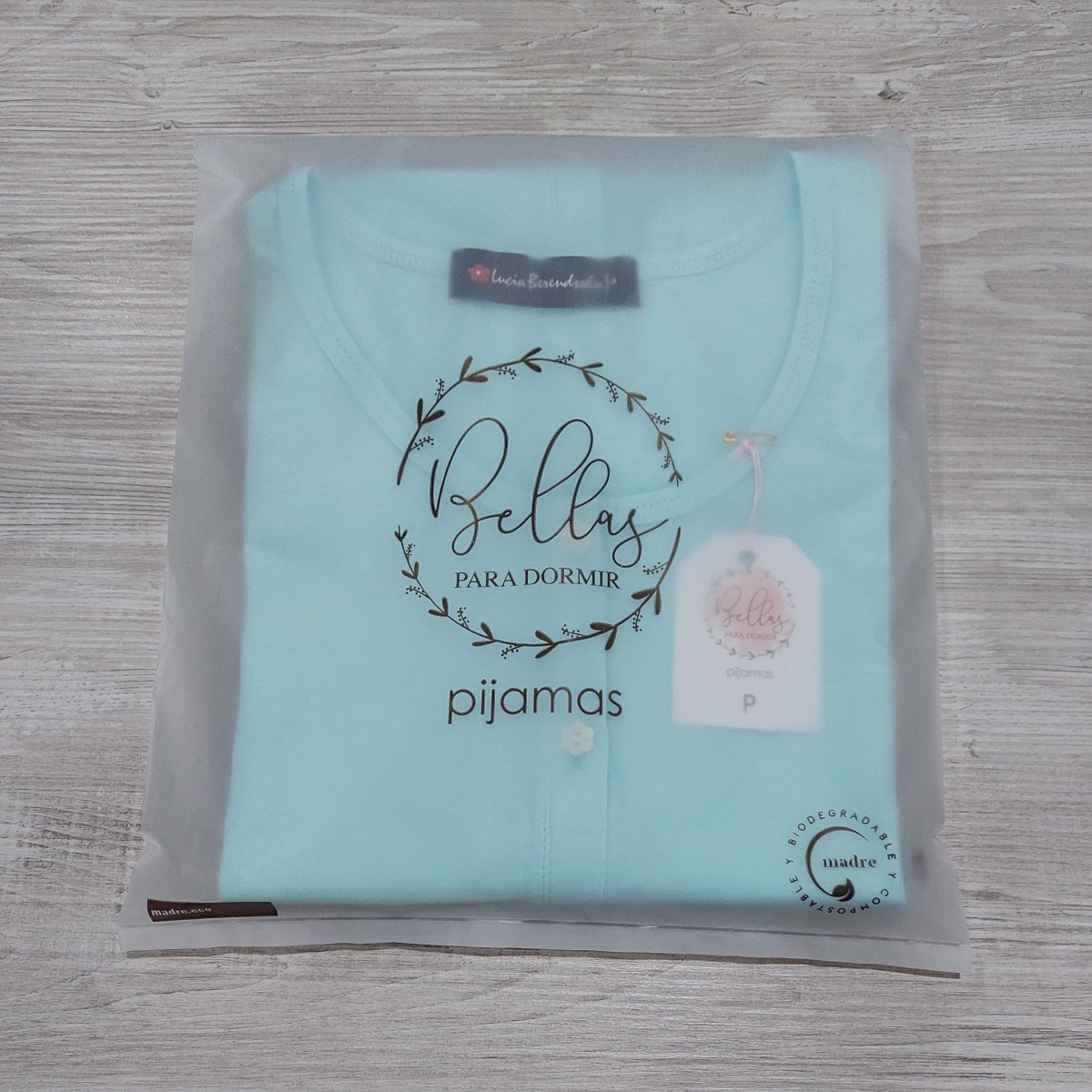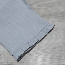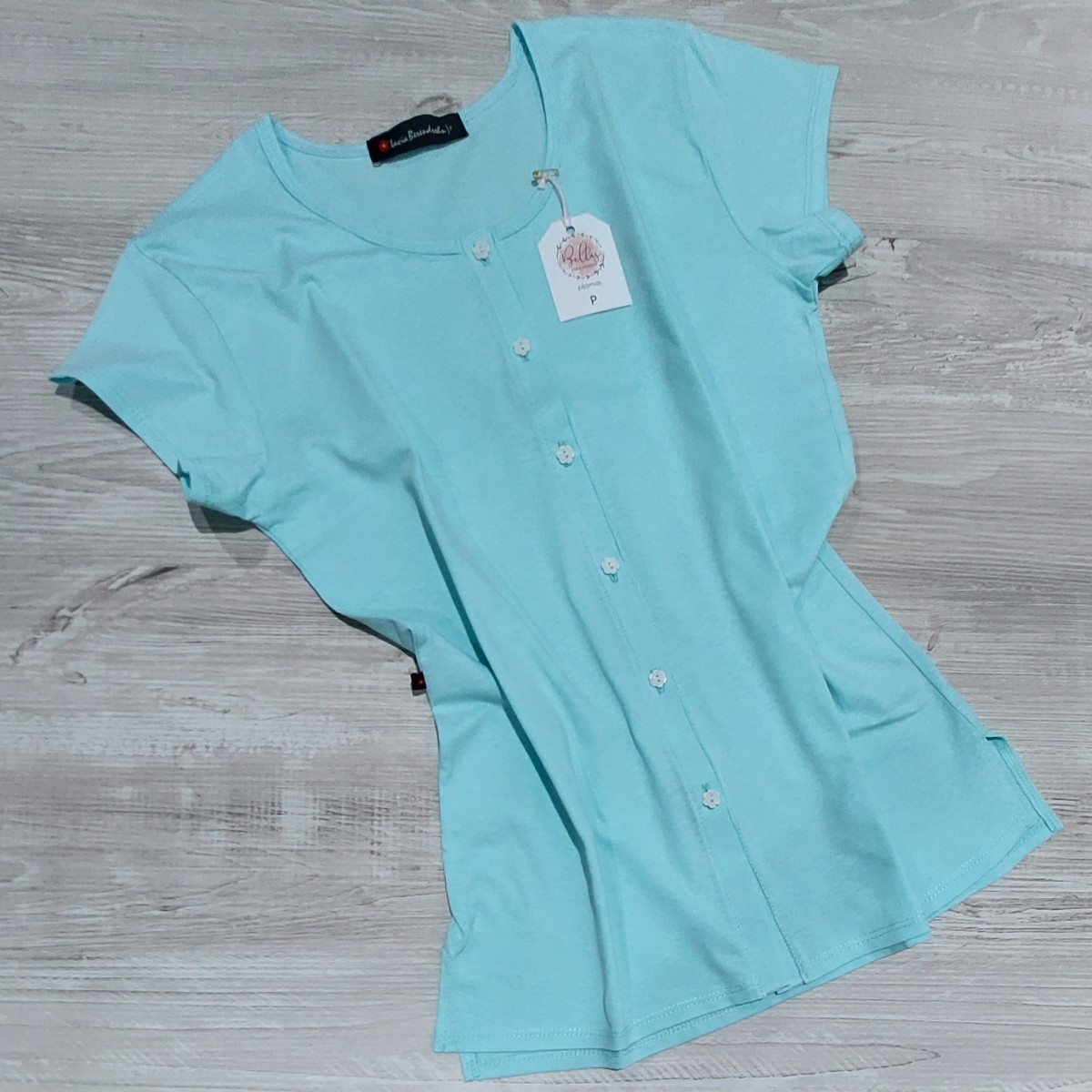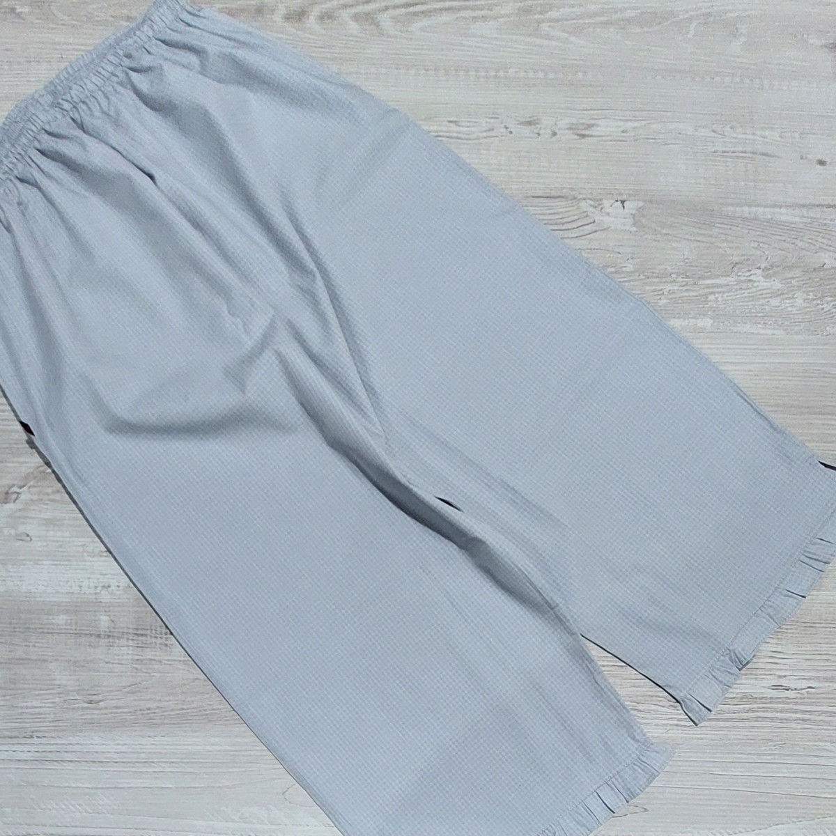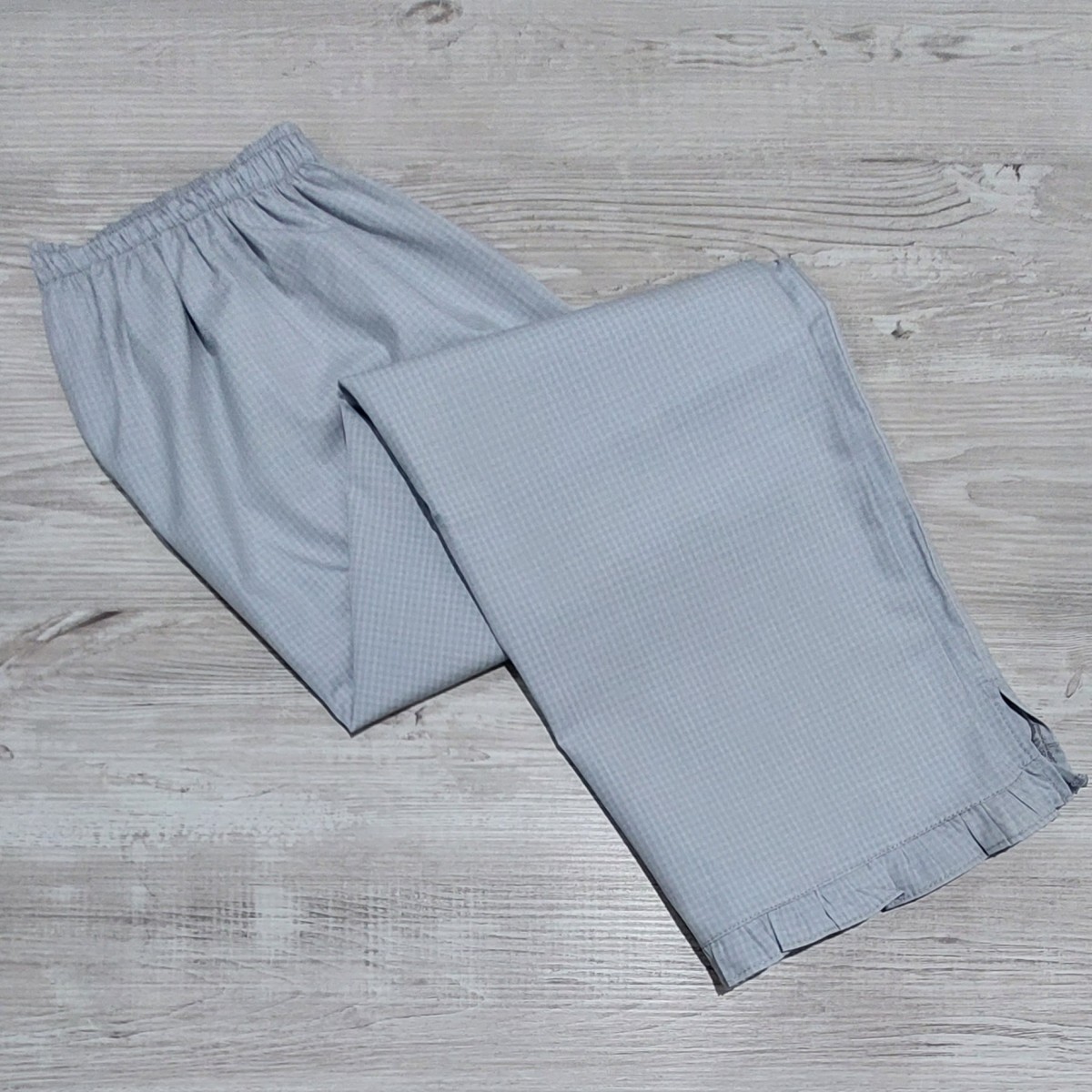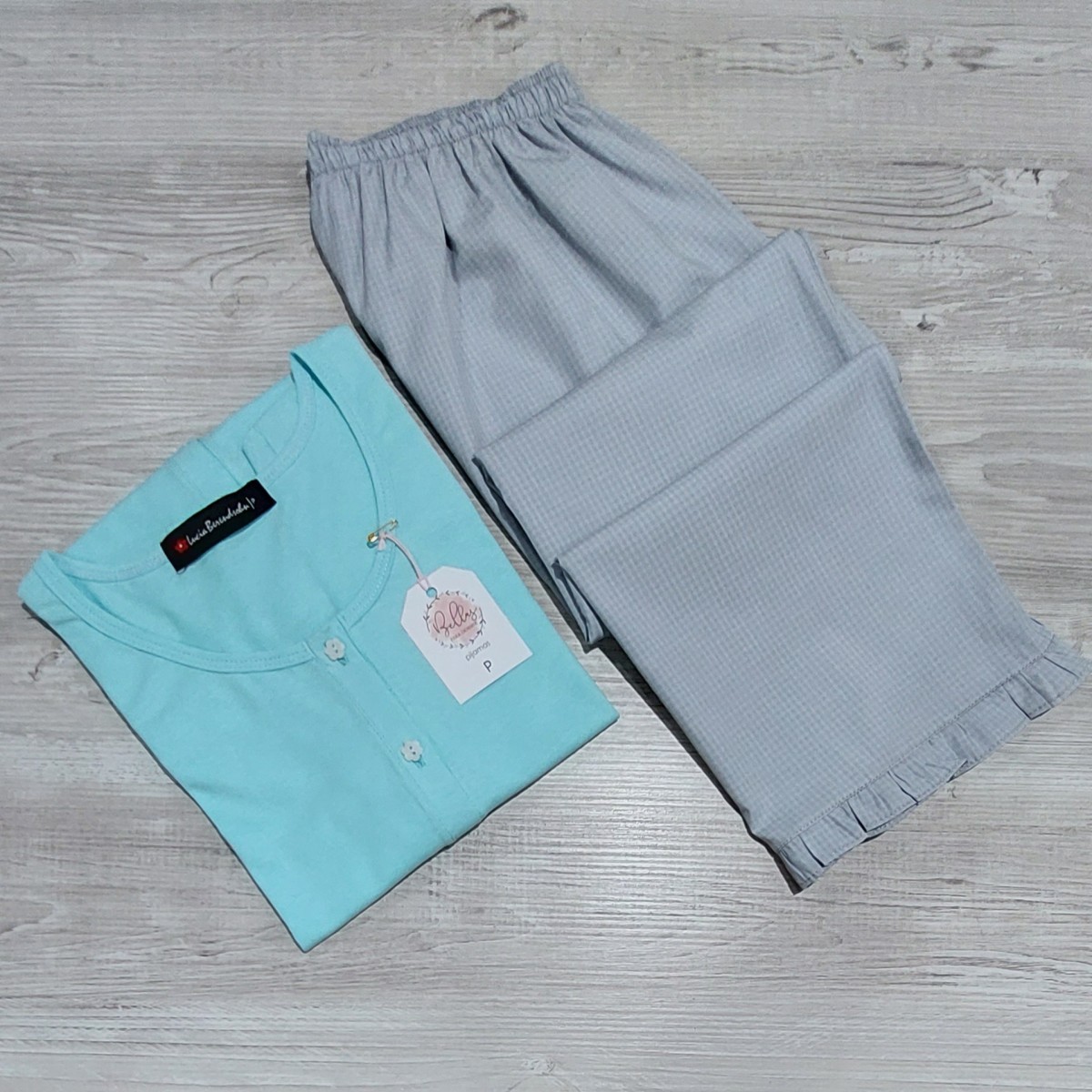 100% algodón. Conjunto de capri (pantalón hasta la media pierna) y remera totalmente abotonada, escote redondo y mini-manga. El capri es de tela de algodón (la tela no es elastizada) y la tela de la remera es semi-elastizada. El ruedo del capri termina en un delicado voladito. La remera es un color agua marina suave y el capri es un cuadrillé en tonos grises (muy clarito).