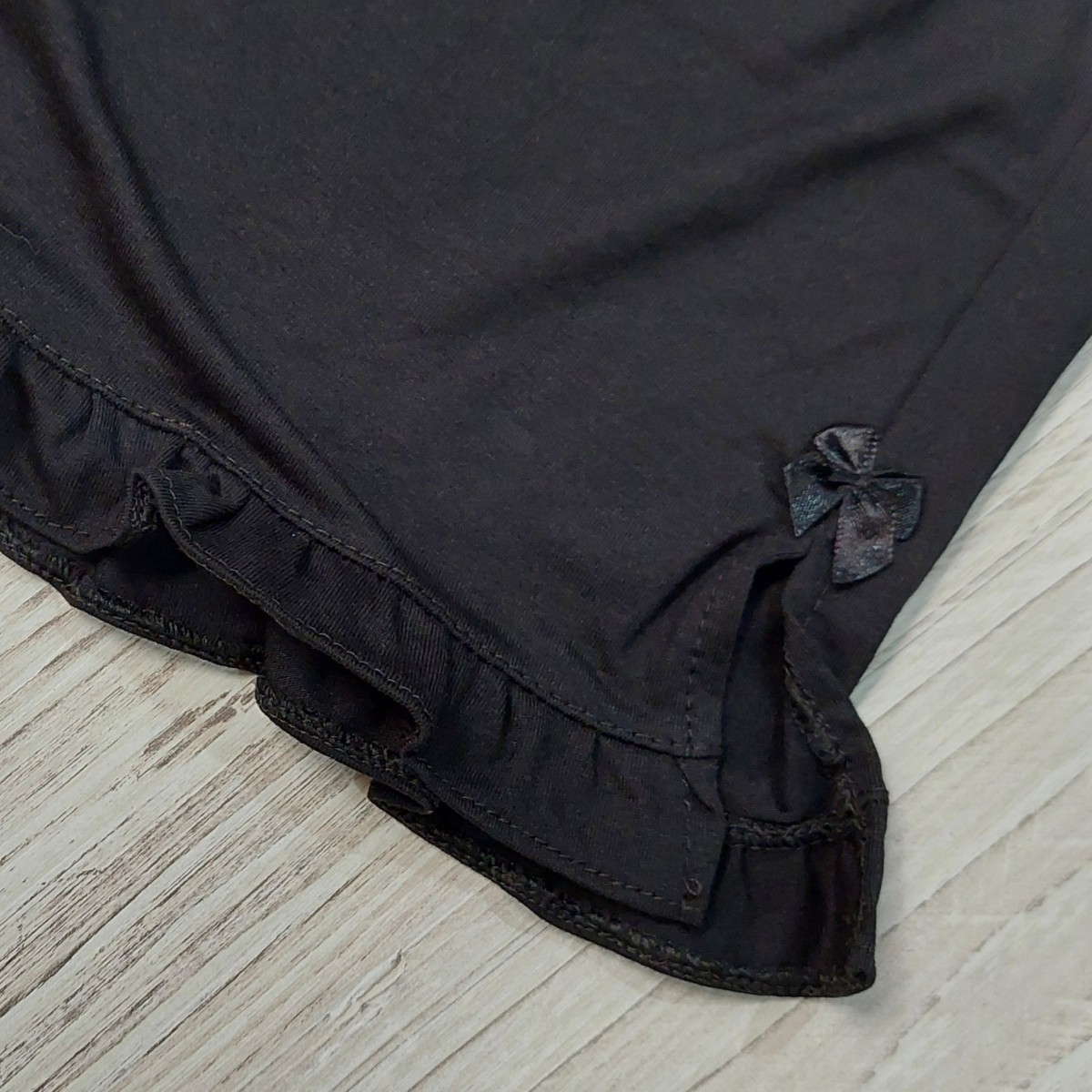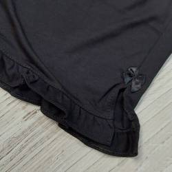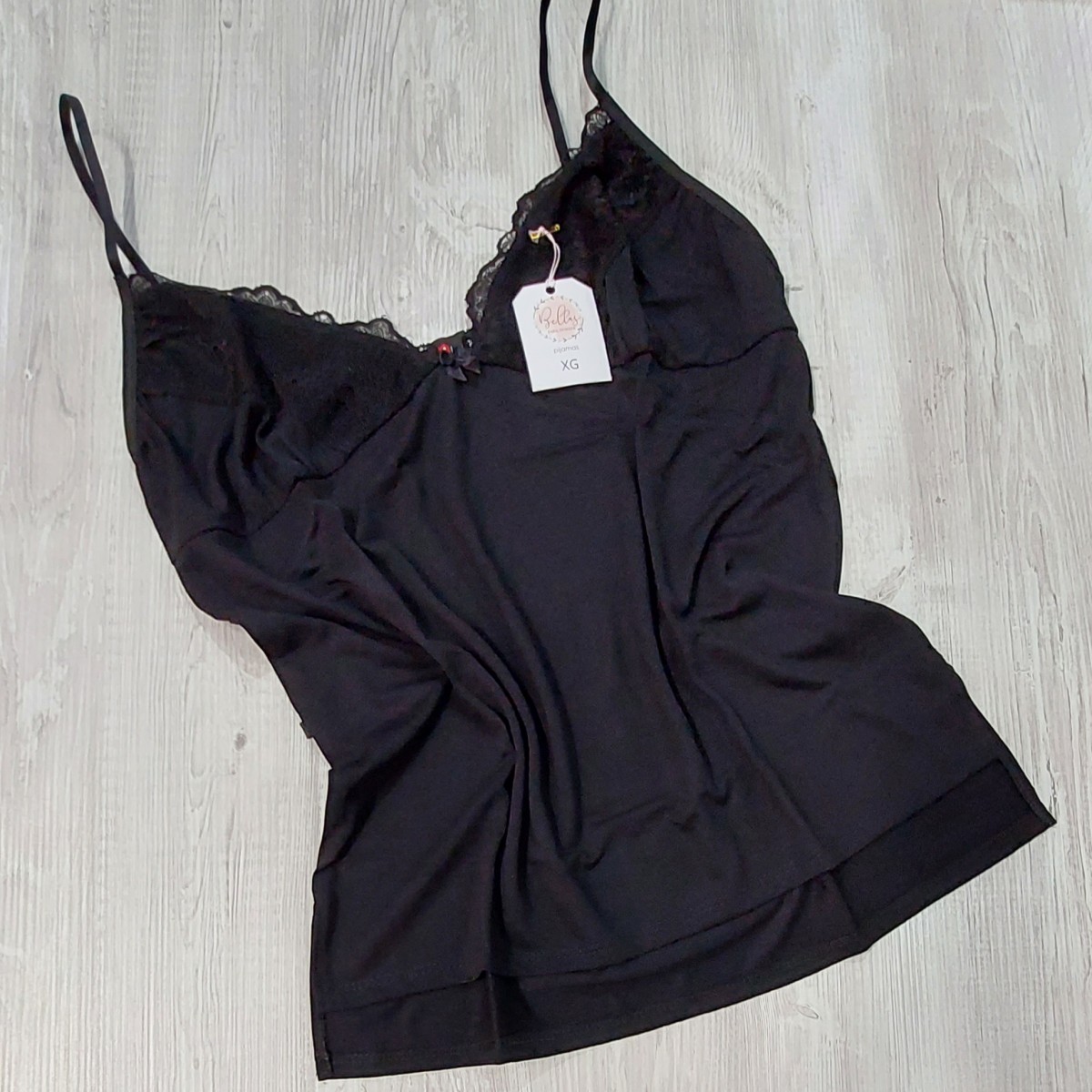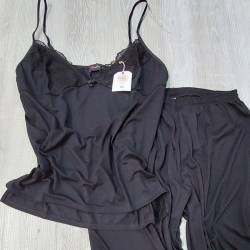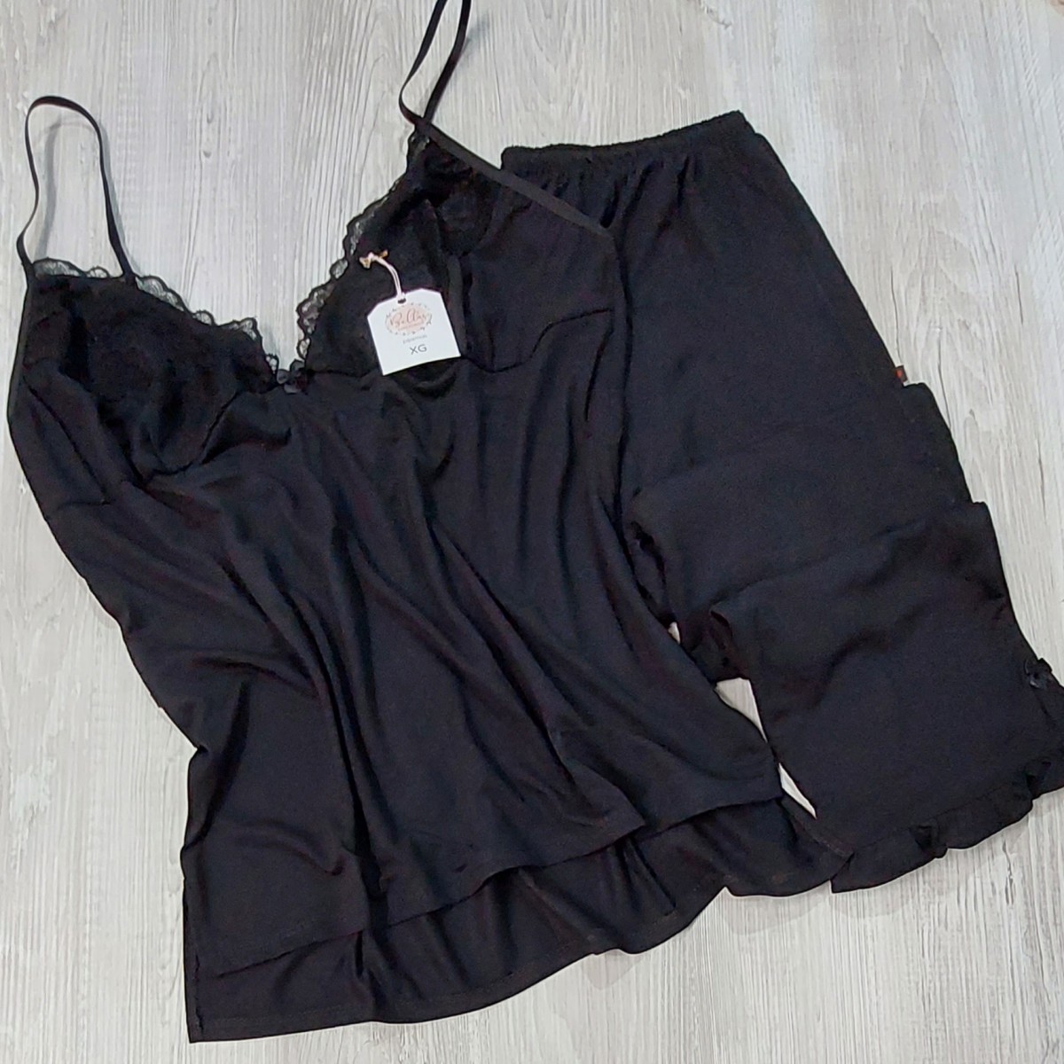 Conjunto de capri (largo hasta media pierna) y solerita con detalle de encaje en el pecho. La tela del conjunto es de color negro y es semi-elastizada. El ruedo del capri tiene un encantador voladito. Los tirantes de la solerita son regulables con reguladores de metal.