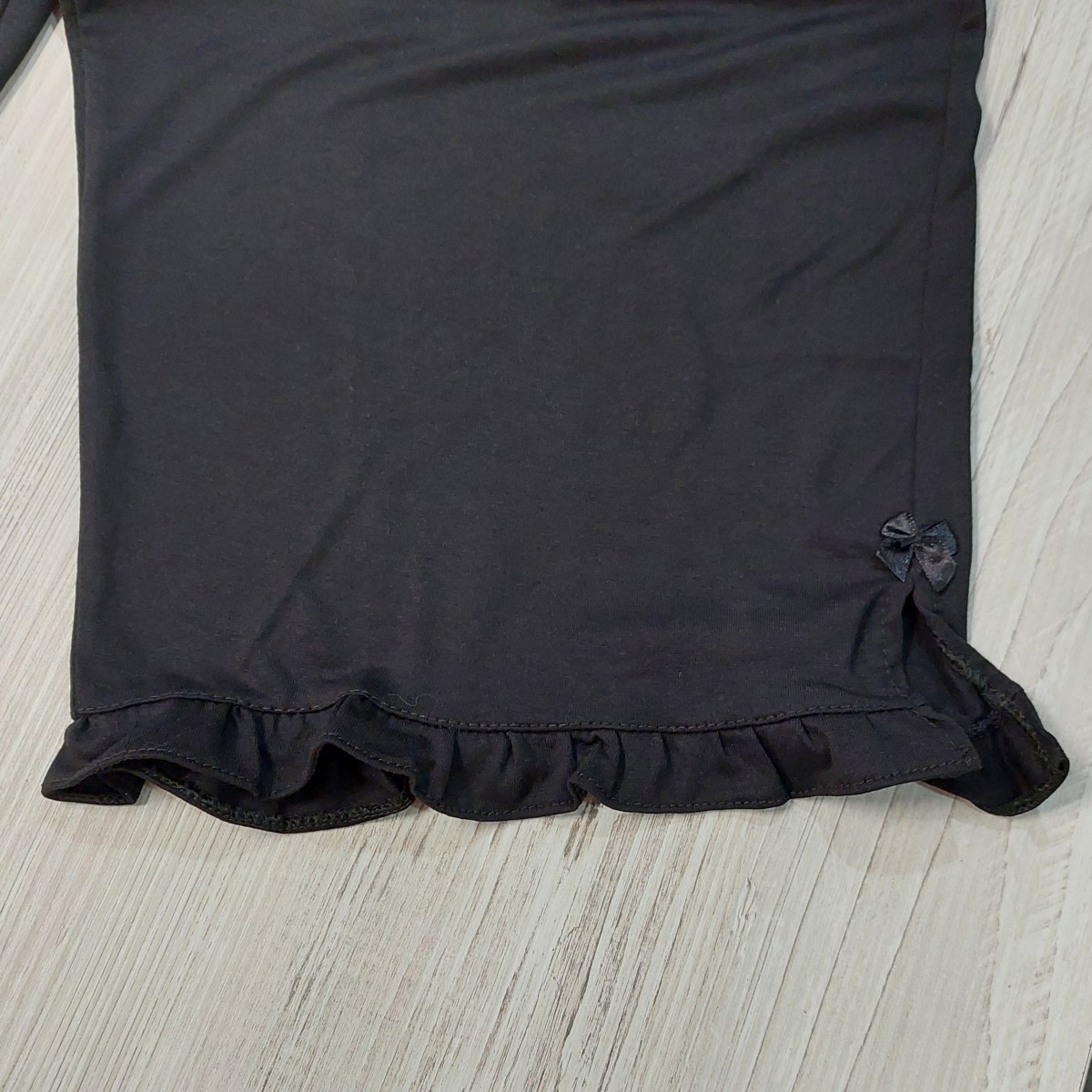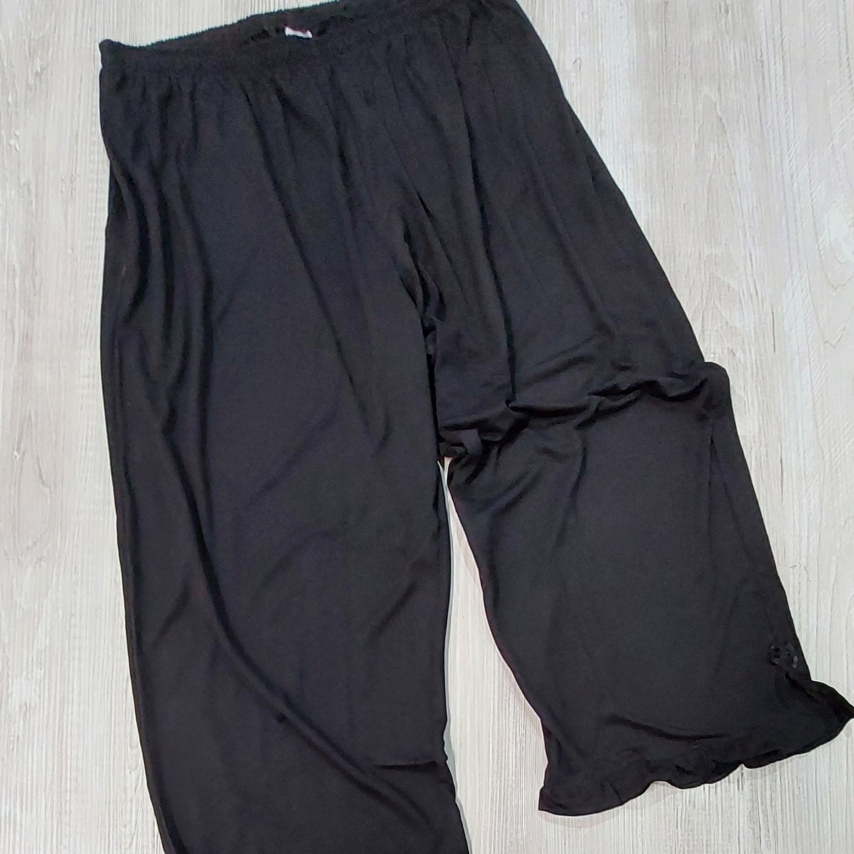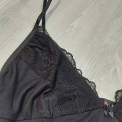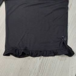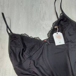 Conjunto de capri (largo hasta media pierna) y solerita con detalle de encaje en el pecho. La tela del conjunto es de color negro y es semi-elastizada. El ruedo del capri tiene un encantador voladito. Los tirantes de la solerita son regulables con reguladores de metal.