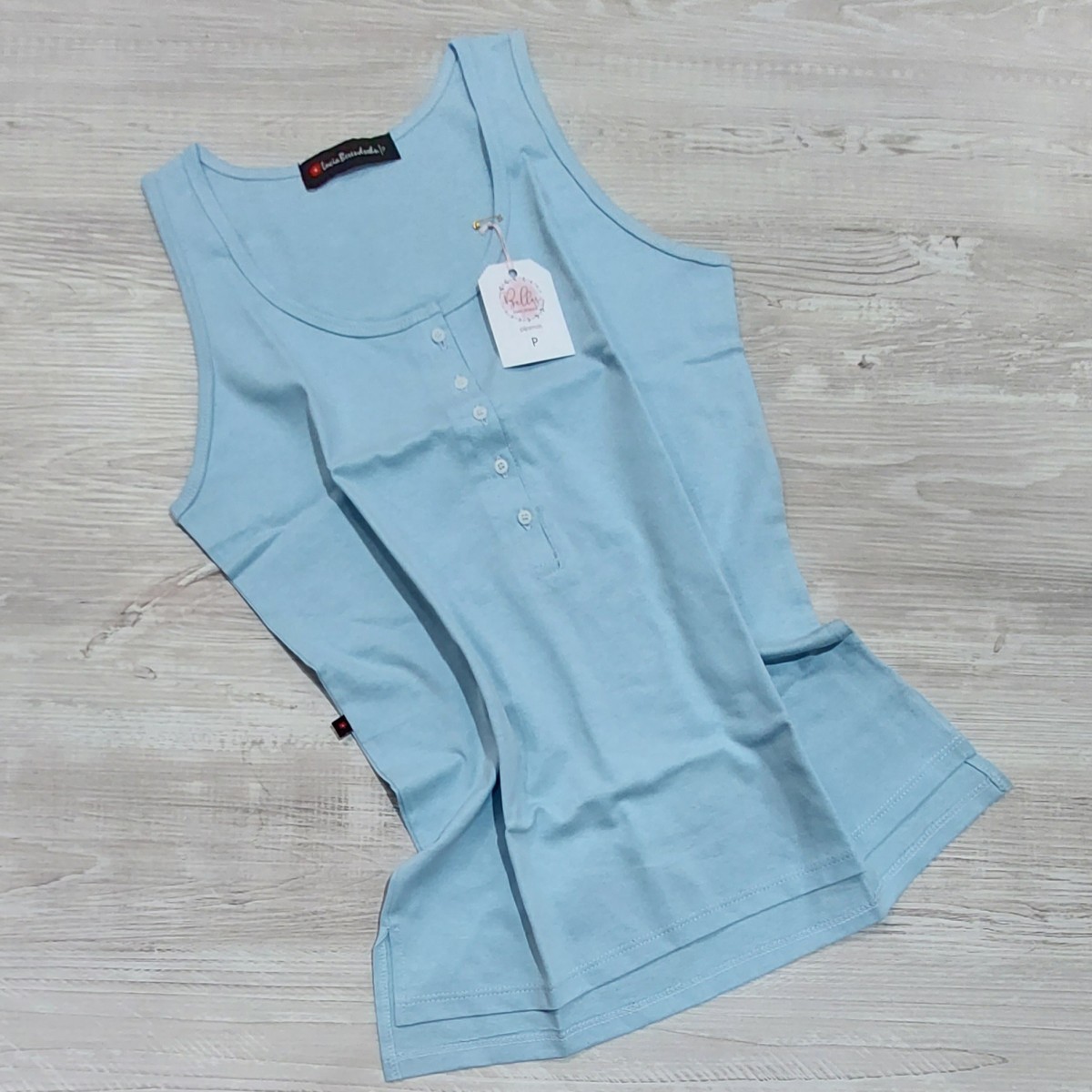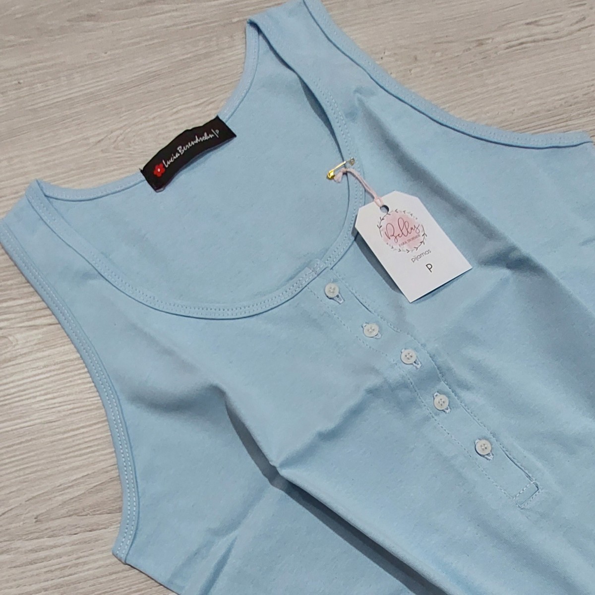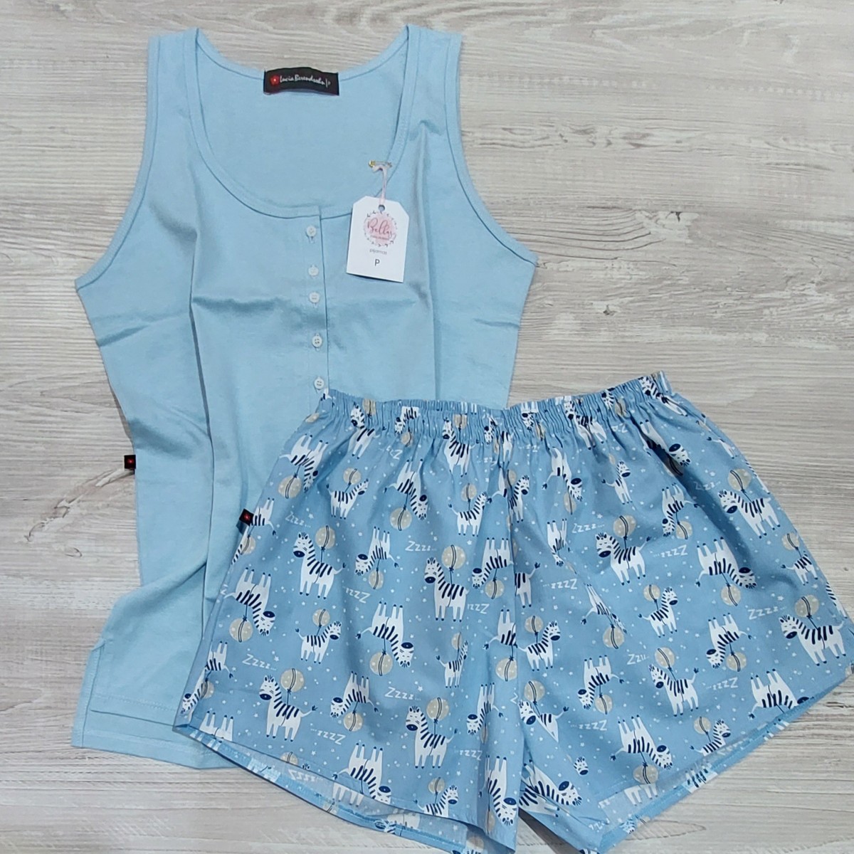 Conjunto de short y camisilla abotonada hasta el pecho 100% algodón. El short es de tela de algodón (no es elastizada) y la tela de la camisilla es semi-elastizada.