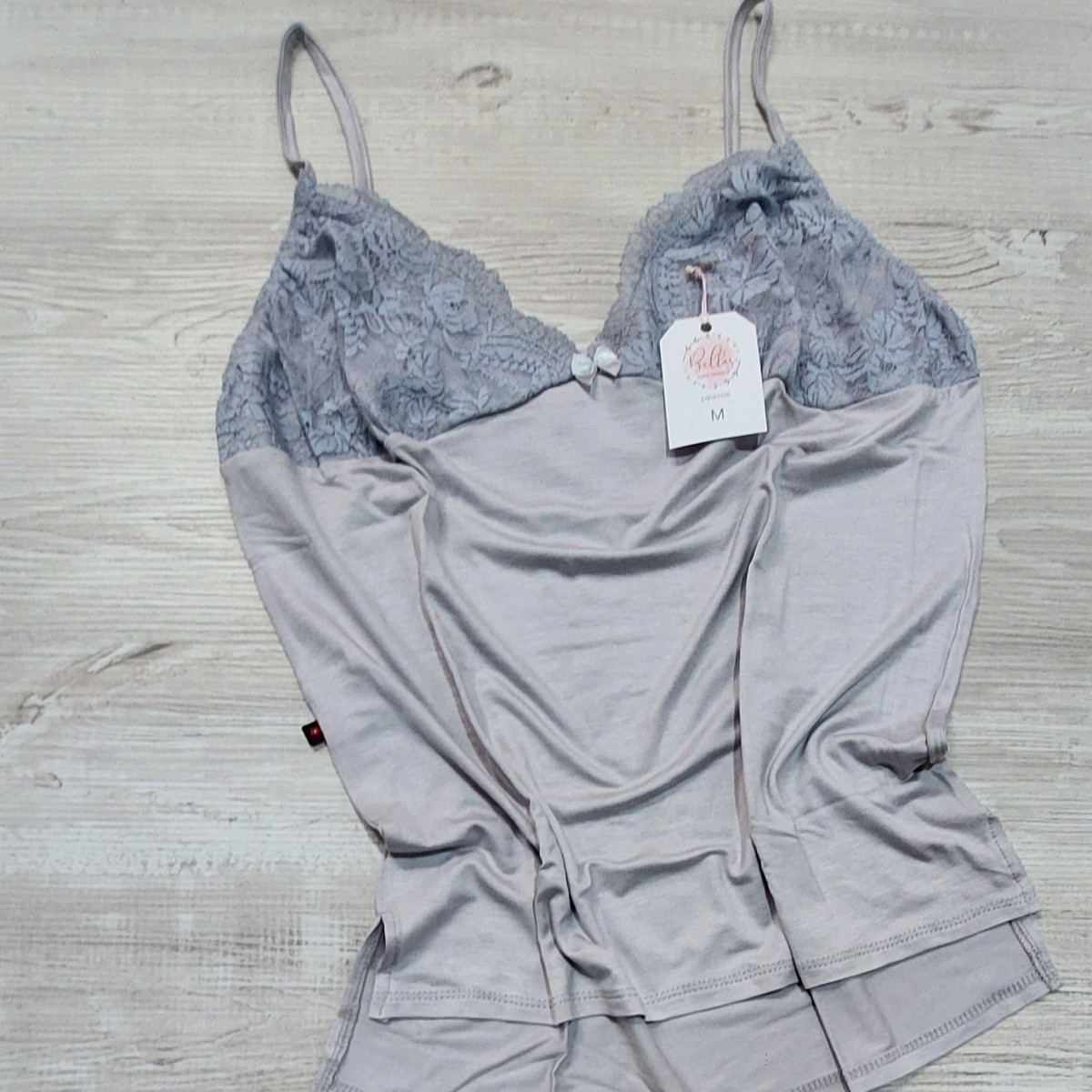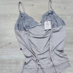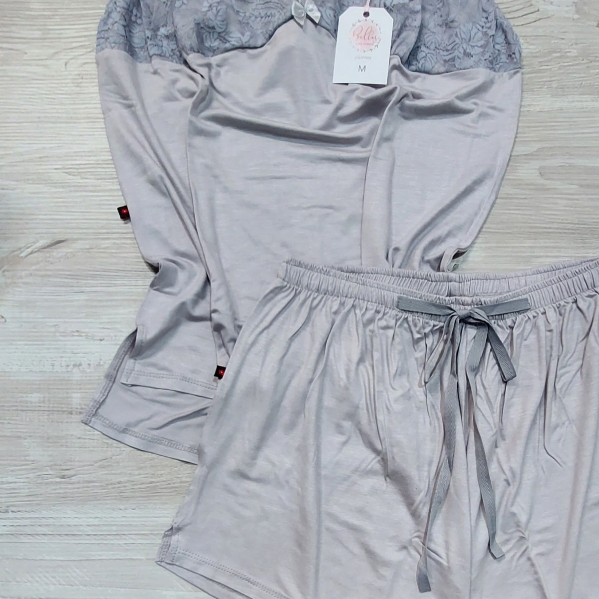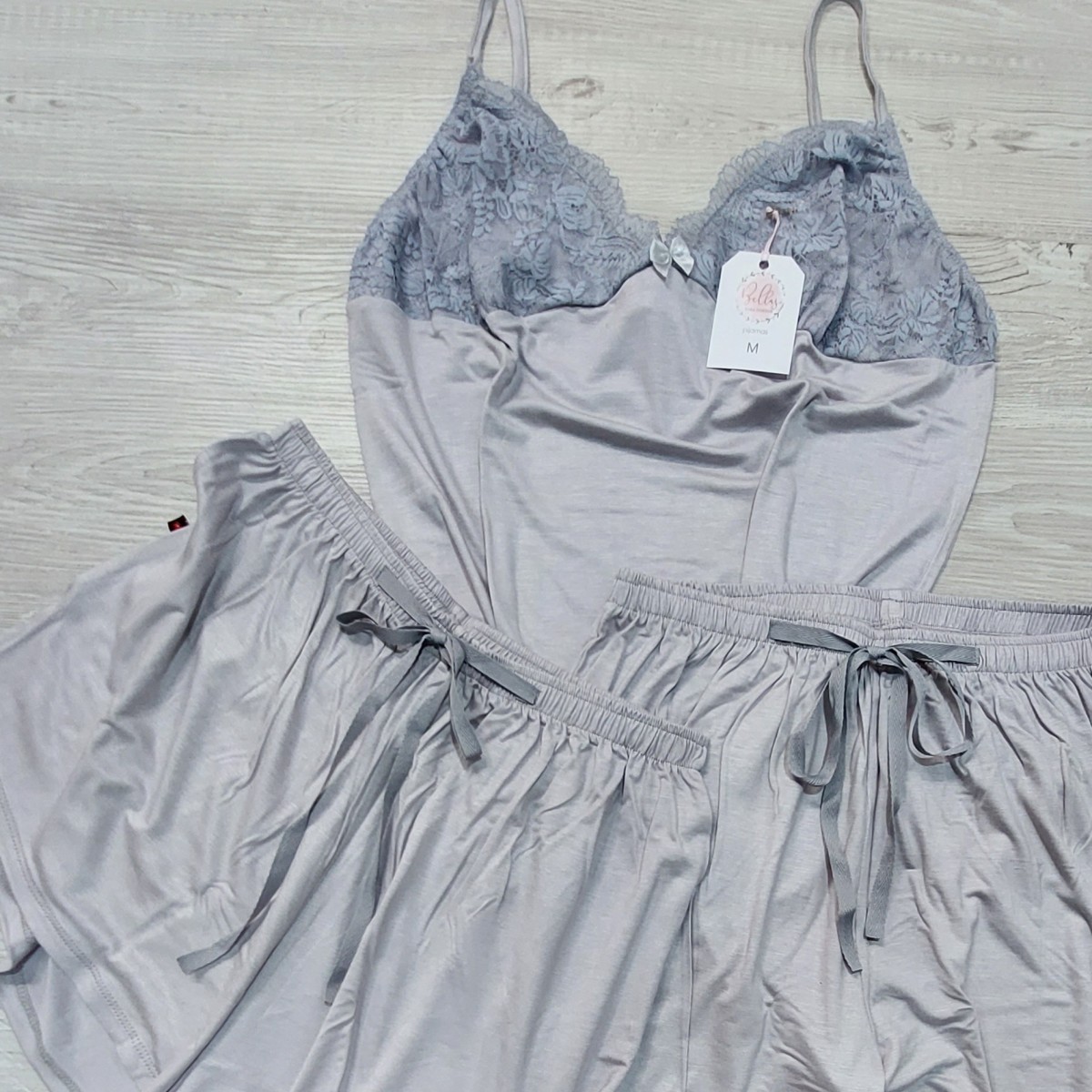 Incluye: 1 solerita con detalles de encaje en el pecho y tirantes regulables, 1 short con lazo al tono, 1 pantalón largo con lazo al tono. La tela es viscosa de algodón (una tela muy suavecita, agradable al tacto y bien elastizada).