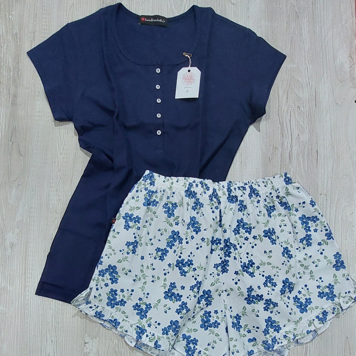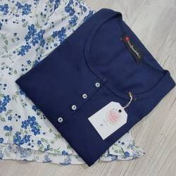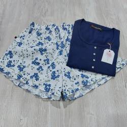 Conjunto 100% algodón. Short con voladitos y remera con mini-manga y abotonada hasta el pecho. La tela de la remera es jersey de algodón peinado 100% algodón y la tela del short es de tela de algodón (no elastizada). Apta para personas alérgicas al poliester.
