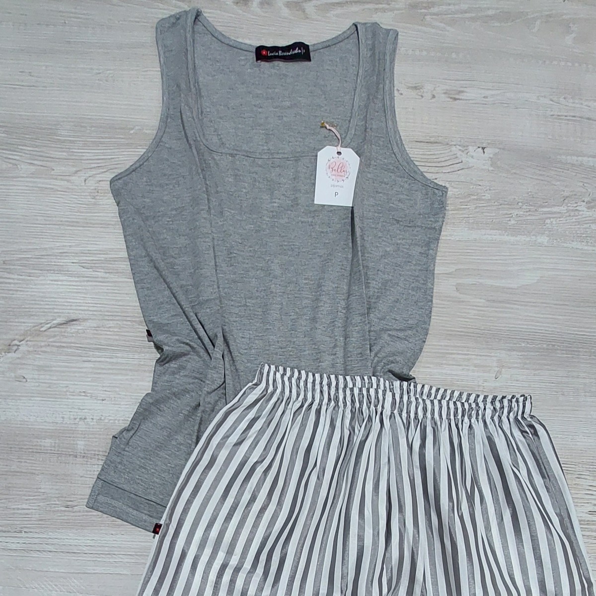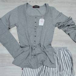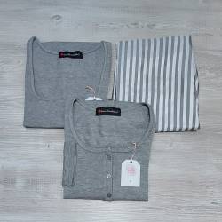 Conjunto de 3 piezas: Incluye 1 pantalón largo de suave satín (la tela no es elastizada), 1 camisilla elastizada con escote cuadrado y una remera totalmente abotonada con mangas largas (se puede usar como saquito sobre la camisilla). La tela de la remera mangas largas y de la camisilla es viscosa de algodón ( es una tela fresca, suave y bien elastizada)